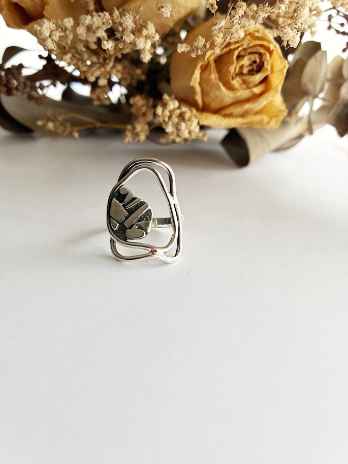 Cette bague est faite d'argent sterling. La texture a été créée par fusion d'argent. La finition est brillante avec une touche d'oxydation pour créer un effet de profondeur. Chaque bague est formée une à une à la main. Ainsi, elle ne sera jamais identifque. Le mouvement dans les fils sont créés instinctivement, sans contrainte ni matrice.