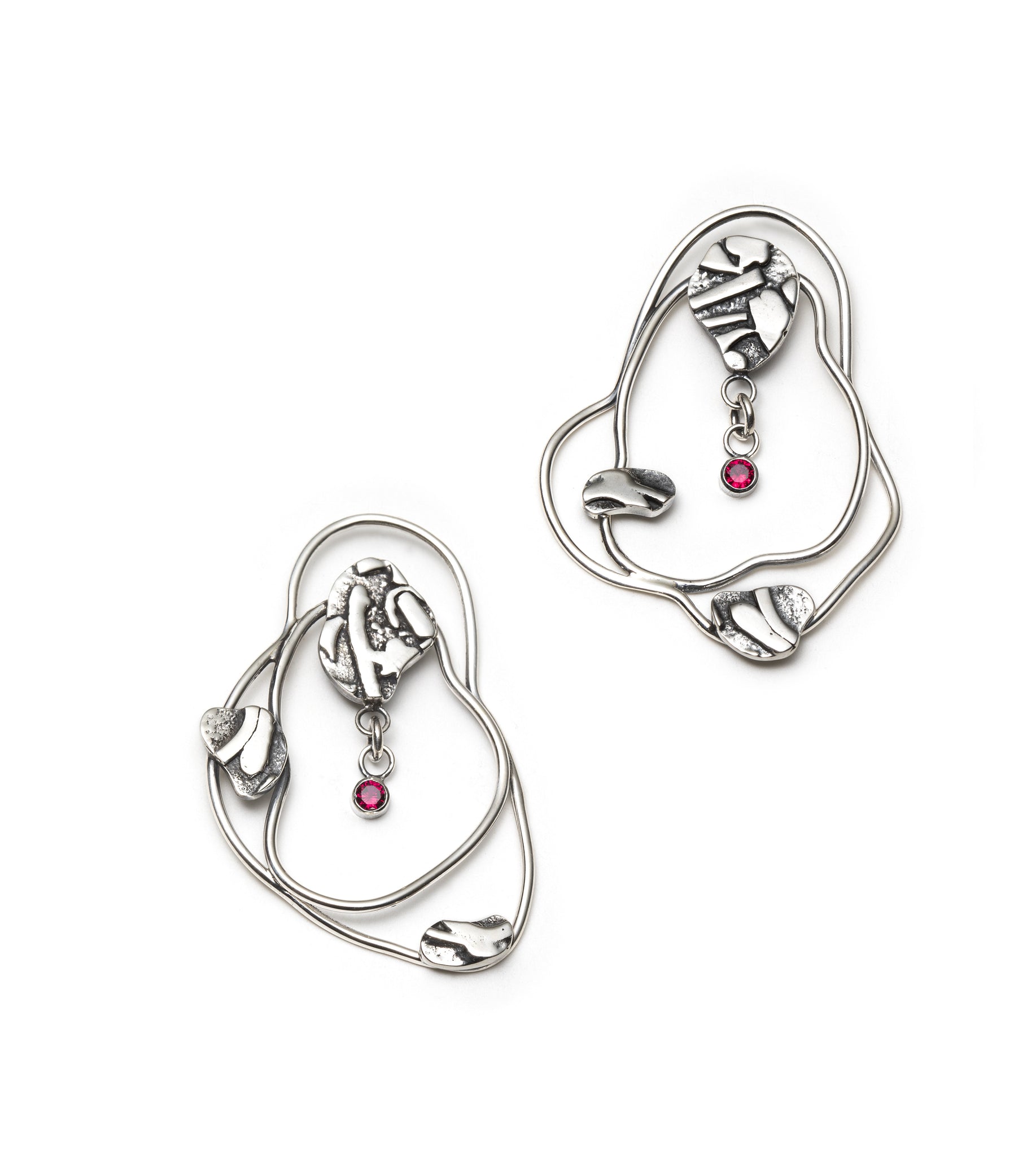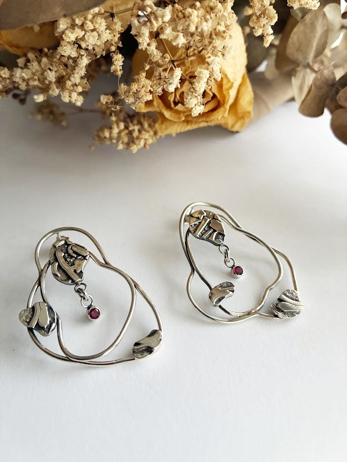 Ces boucles d'oreilles sont faites d'argent sterling. Elles sont serties de rubis de laboratoire. La texture a été créée par fusion d'argent. La finition est brillante avec une touche d'oxydation pour créer un effet de profondeur.