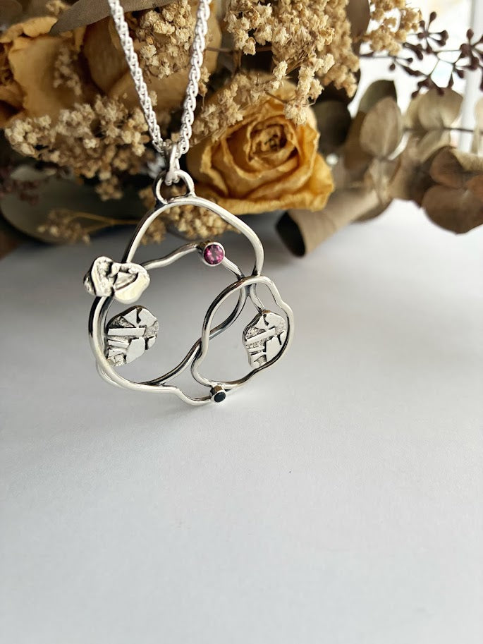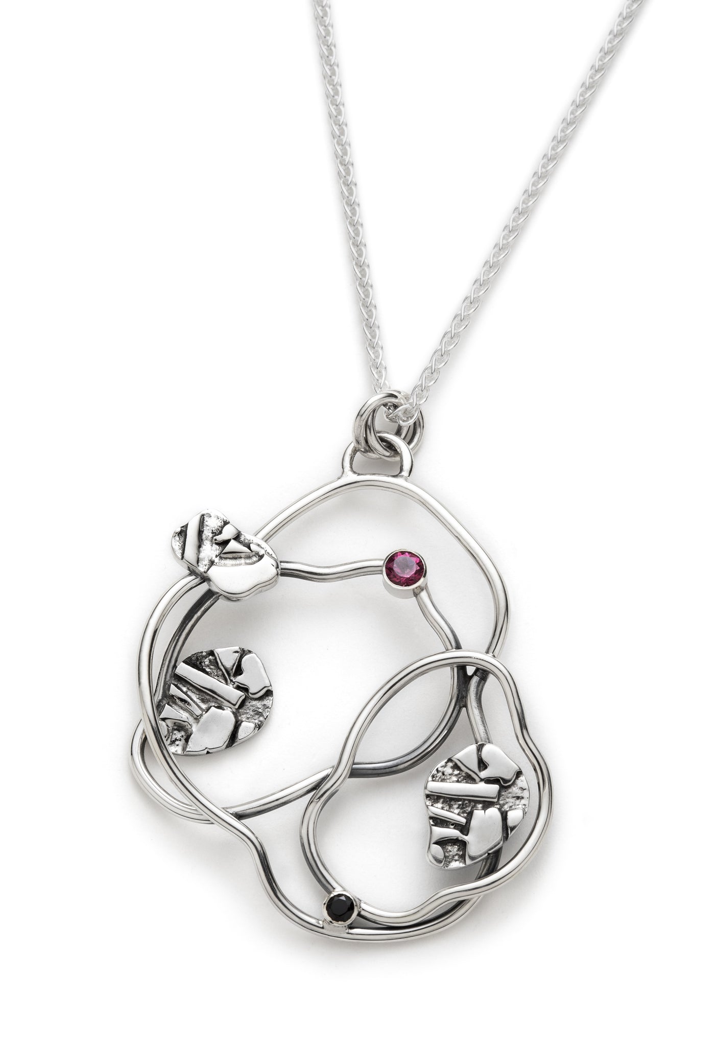 Ce pendentif est fabriqué en argent sterling et vient avec une chaîne blé en argent également. Il est serti d'un grenat rhodolite (teinte rose foncé) ainsi que d'un spinelle noir. Les 2 pierres sont naturelles. Il s'agit d'une pièce unique ; il n'y a qu'un seul exemplaire de disponible. Les anneaux sont formés à la main, sans matrice. Ils sont formés instinctivement, au gré de mon envie. La texture est réalisée par fusion d'argent.