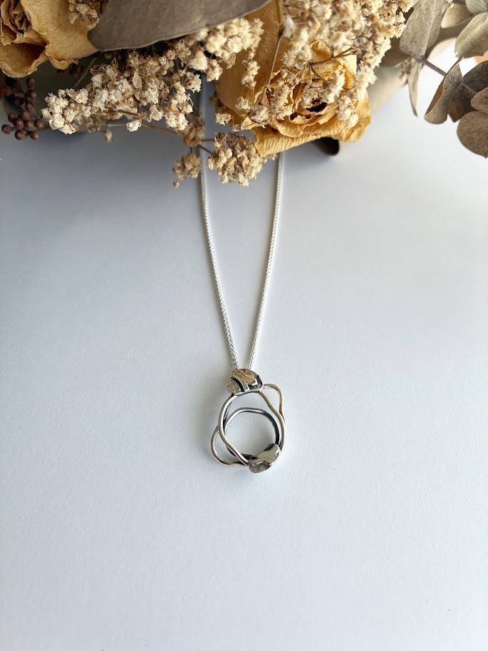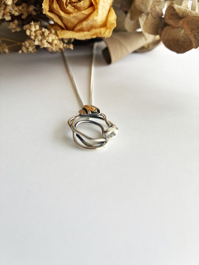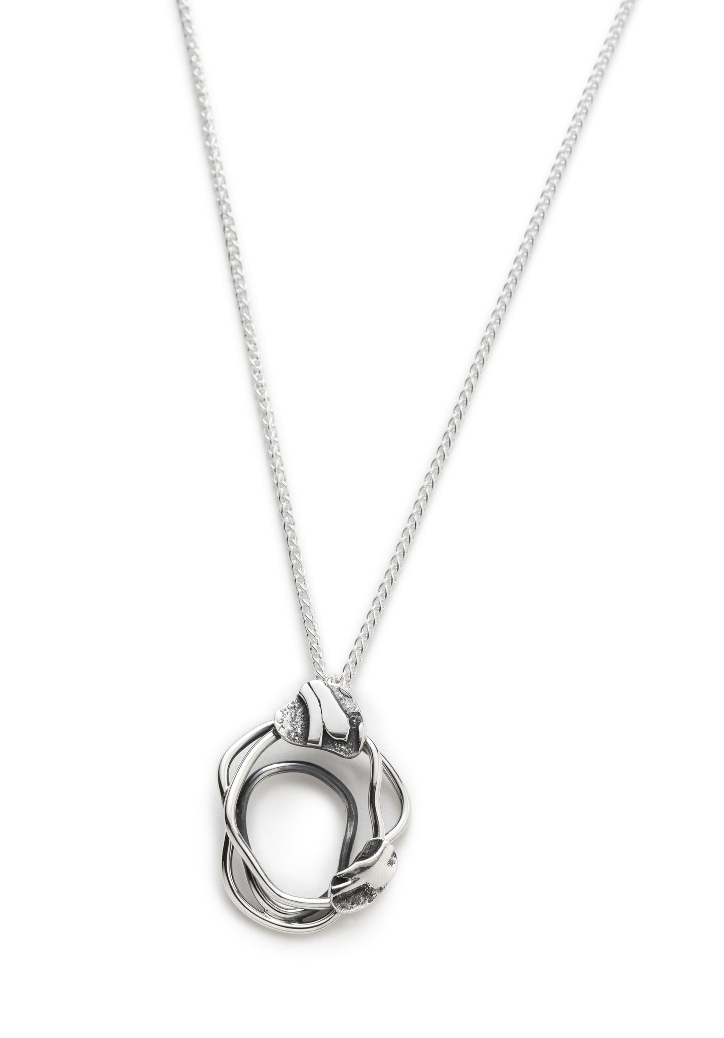 Fabriqué en argent sterling, ce pendentif pourrait être reproduit plusieurs fois en étant toujours unique. Les anneaux ondulés sont créés un à un à la main et ensuite soudés ensemble de sorte à composer une pièce dynamique. La texture a été créée par fusion d'argent. La finition est brillante avec une touche d'oxydation pour créer un effet de profondeur.