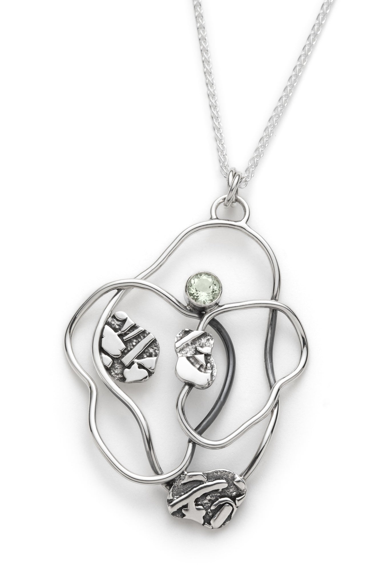 Ce pendentif est fait d'argent sterling. La texture a été réalisée par fusion d'argent. Une prasiolite naturelle de 6 millimètres de diamètre est sertie sur le pendentif. Il s'agit d'une pierre vert pâle. La finition est brillante avec une touche d'oxydation pour créer un effet de profondeur.